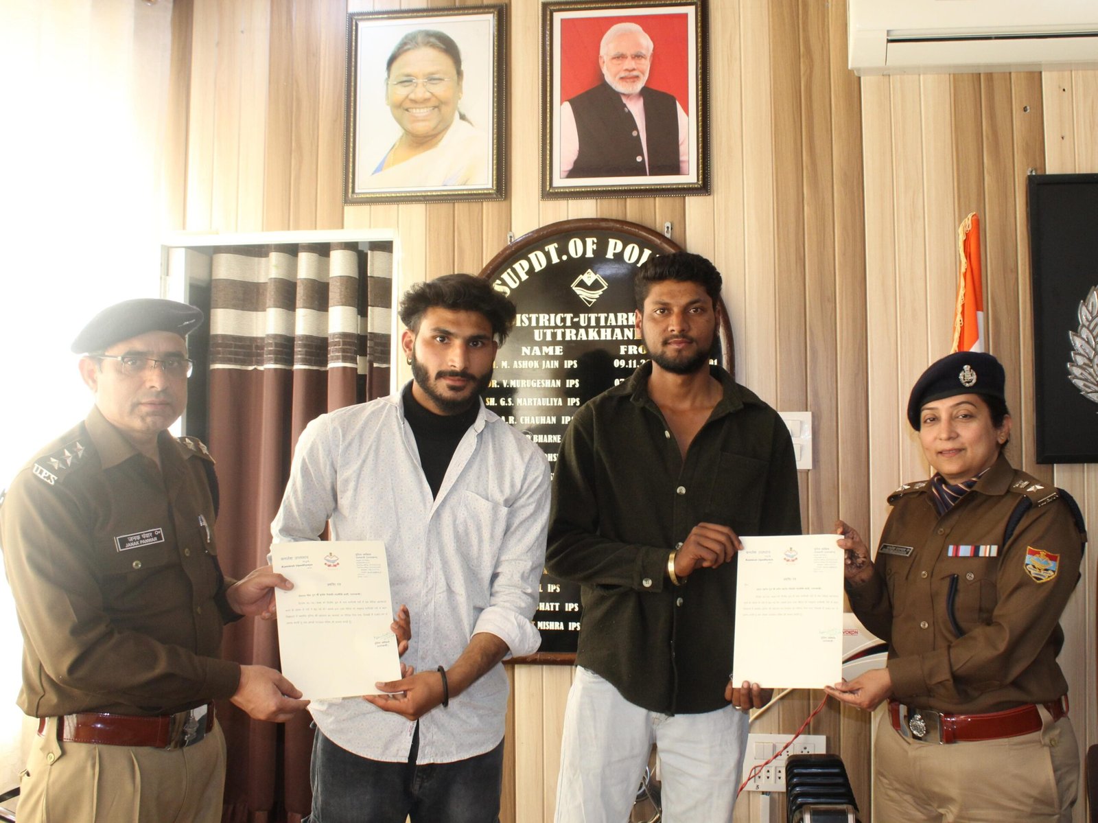 *पुलिस अधीक्षक उत्तरकाशी, श्रीमती कमलेश उपाध्याय* द्वारा रेस्क्यू में सहयोग कर महिला की जान बचाने वाले वाले दोनों युवकों को आज को पुलिस कार्यालय मे बुलाकर प्रशस्ति पत्र देकर सम्मानित किया गया। युवकों द्वारा किये गये मानवीय कार्य की सराहना करते हुये उज्ज्वल भविष्य हेतु शुभकामनाएं दी गयी। पुलिस को आत्महत्या करने का प्रयास करने वाली महिला की काउंसलिंग करने के निर्देश दिये गये।